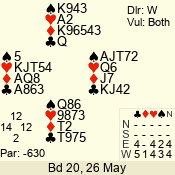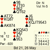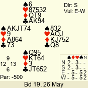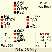 | Con | Dc | Res | Score | Ld | Pairs | Rd | Tbl | | 3 NT | S | = | 600 | Q | 03 - 04 | 5 | 3 |