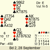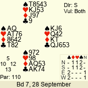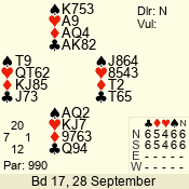 | Con | Dc | Res | Score | Ld | Pairs | Rd | Tbl | | 6 NT | N | = | 990 | 4 | 01 - 03 | 5 | 1 |