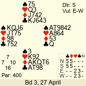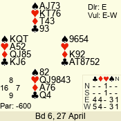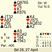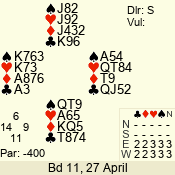 | Con | Dc | Res | Score | Ld | Pairs | Rd | Tbl | | 3 NT | W | -4 | 400 | 6 | 06 - 03 | 4 | 6 |