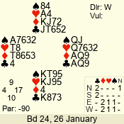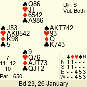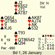 | Con | Dc | Res | Score | Ld | Pairs | Rd | Tbl | | 6 NT | S | = | 990 | 3 | 02 - 05 | 3 | 2 |