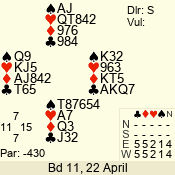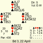 | Con | Dc | Res | Score | Ld | Pairs | Rd | Tbl | | 3 NT | N | +1 | 430 | 3 | 03 - 03 | 1 | 3 |