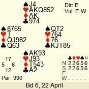 | Con | Dc | Res | Score | Ld | Pairs | Rd | Tbl | | 6 NT | S | +1 | 1020 | 8 | 04 - 03 | 2 | 4 |