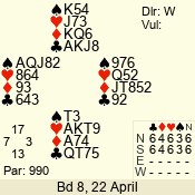 | Con | Dc | Res | Score | Ld | Pairs | Rd | Tbl | | 3 NT | S | +3 | 690 | 9 | 04 - 01 | 4 | 4 |