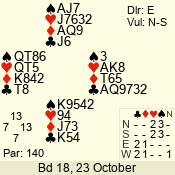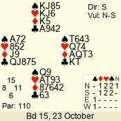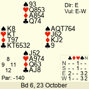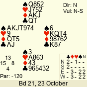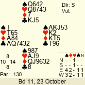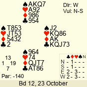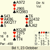| Con | Dc | Res | Score | Ld | Pairs | Rd | Tbl | | 2 NT | N | +1 | 150 | K | 03 - 04 | 4 | 3 |