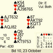 | Con | Dc | Res | Score | Ld | Pairs | Rd | Tbl | | 3 NT | S | +1 | 630 | 6 | 02 - 03 | 4 | 2 |