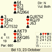 | Con | Dc | Res | Score | Ld | Pairs | Rd | Tbl | | 3 NT | N | +2 | 660 | 7 | 01 - 03 | 3 | 1 |