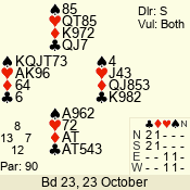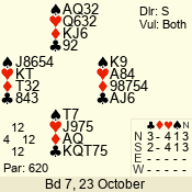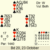 | Con | Dc | Res | Score | Ld | Pairs | Rd | Tbl | | 6 NT | N | = | 1440 | 3 | 01 - 02 | 4 | 1 |