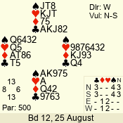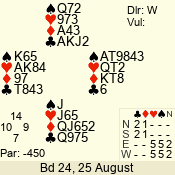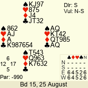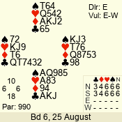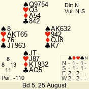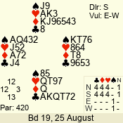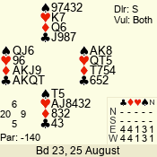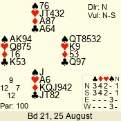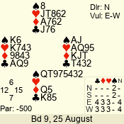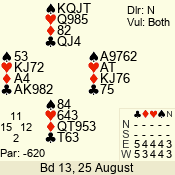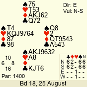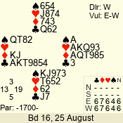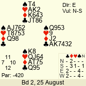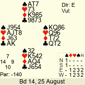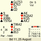 | Con | Dc | Res | Score | Ld | Pairs | Rd | Tbl | | 3 N | E | -1 | 100 | | 04 - 02 | 3 | 4 |