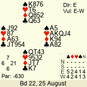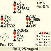 | Con | Dc | Res | Score | Ld | Pairs | Rd | Tbl | | 3 N | E | -1 | 100 | | 04 - 03 | 2 | 4 |