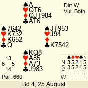 | Con | Dc | Res | Score | Ld | Pairs | Rd | Tbl | | 3 N | S | +2 | 660 | | 03 - 02 | 2 | 3 |