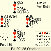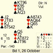 | Con | Dc | Res | Score | Ld | Pairs | Rd | Tbl | | 1 NT x | N | = | 180 | 4 | 01 - 01 | 1 | 1 |