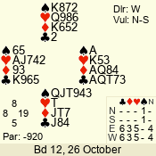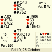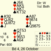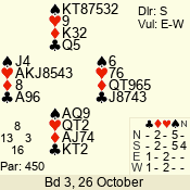 | Con | Dc | Res | Score | Ld | Pairs | Rd | Tbl | | 3 NT | S | +2 | 460 | 8 | 04 - 01 | 4 | 4 |