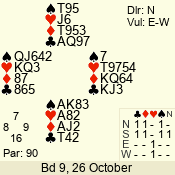 | Con | Dc | Res | Score | Ld | Pairs | Rd | Tbl | | 3 NT | N | +1 | 630 | 7 | 09 - 02 | 8 | 9 |